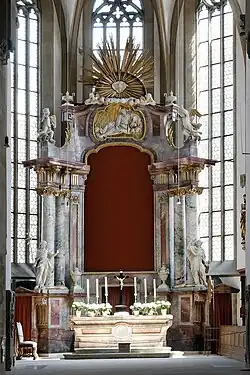 Der Hochaltar in der Mitte des großen Chorraums, geschaffen 1783 von Materno Bossi, kam im Jahr 1806 nach der Säkularisation des Klosters Heidenfeld in die Johanniskirche. Auf dem ursprünglichen Altarbild von Oswald Onghers, das durch eines des Malers Johann Adam Philipp Stößel ersetzt wurde, war die Kreuzigung dargestellt. Bekrönt wird der Altar von der den Heiligen Geist symbolisierenden Taube im Strahlenkranz.