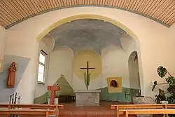 Alois Spichtig schuf auch die Wandbemalung im Chor. Links, hinter dem Ambo als Ort des Wortes, ist symbolisch der Berg Sinai als Ort der Gottesbegegnung dargestellt. Auf der Spitze steht in griechischen Buchstaben ΛΟΓΟΣ (Logos) (das Wort) und schafft so den Bezug zum Wortgottesdienst als erstem Teil jedes katholischen Gottesdienstes. An der Rückwand befindet sich ein schlichtes Kreuz, das Alois Spichtig durch die Gestaltung der Wand in eine Ähre umgedeutet hat. Dies verweist auf die Symbolik der Eucharistie (Weizenkorn, Brot, Leib Christi) als zweiten Teil des katholischen Gottesdienstes. Hinter dem Kreuz befindet sich eine leuchtend gelbe Kreisscheibe, die an der linken Wand in einer gelben Fläche um den Tabernakel herum ihre Entsprechung findet. Die Farbe Gelb versinnbildlicht das Heilige, das Göttliche. Die Decke des Chors wurde von Alois Spichtig blau gestrichen und verweist damit auf den Himmel.