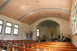 Im Kirchenschiff befindet sich im hinteren Bereich eine Orgelempore, eine flach gewölbte Decke schliesst den Kirchraum nach oben ab. Ein Triumphbogen bildet den Übergang vom Längsschiff der Kirche zum polygonalen Chor. Tagsüber wird der Kirchenraum von einfachen Rechteck-Sprossenfenstern aus klarem Glas belichtet. Im Jahr 1968 wurde der Altarbereich an die Vorgaben der Liturgiekonstitution des Zweiten Vatikanischen Konzils angepasst.