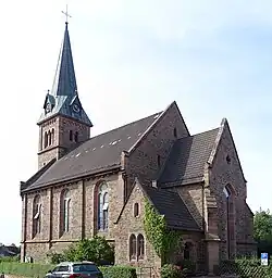 Die einschiffige neugotische Kirche steht auf einer kleinen Anhöhe nahe der Bundesstraße 243 in rund 240 Meter Höhe über dem Meeresspiegel. Der ortsansässige Architekt Peters erstellte den Vorentwurf, den Christoph Hehl revidierte und umsetzte.[6] Ihr an der Nordfassade stehender Turm mit quadratischer Grundform ist weithin sichtbar.