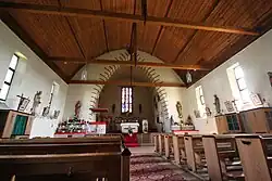 Der Innenraum des Langhauses ist mit einem am Dachstuhl hängenden hölzernen Tonnengewölbe überspannt. Der Gewölbeschub wird durch Zugbalken aufgefangen.