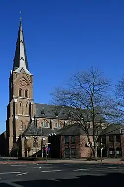 Der Entwurf der Kirche im neogotischen Stil stammt von dem Neusser Architekten Julius Busch. Es ist ein dreischiffiger Bau aus Backstein-Mauerwerk mit 56 Meter hohem Turm. Er entstand unter reger Beteiligung der Bevölkerung, und viele Ausstattungsstücke wurden gestiftet.
