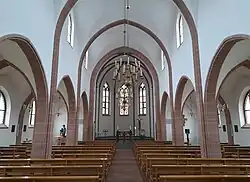 Das Hauptportal der Kirche im Nordosten führt über einen kleinen Vorraum unter der Orgelempore ins Innere des Kirchenraums. Ein auf den Chorraum im Südwesten zustrebender Mittelgang und zwei Seitengänge trennen vier Bankblöcke voneinander.