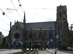 1898 hatte die Zahl der Katholiken in Malstatt bereits die Marke von 10.000 überschritten, und somit reichten auch die Plätze der Notkirche nicht mehr aus. Man begann mit der Planung eines großen Kirchengebäudes, für das man den alten Friedhof an der Friedrichstraße (heute St.-Josef-Straße) als Bauplatz erwerben konnte. Mit dem ersten Spatenstich am 7. September 1908 begann nach Plänen des Architekten Johann Adam Rüppel (Bonn) das Bauvorhaben. In einer Bauzeit von nur zwei Jahren wurde die Kirche fertiggestellt und am 11. September 1910 eingeweiht. Die feierliche Konsekration des Gotteshauses nahm der damalige Trierer Bischof Michael Felix Korum am 10. Mai 1911 vor.[25]
