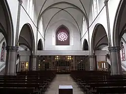 In Richtung des geosteten Chores rahmt ein Triumphbogen die eingezogene, sterngewölbte Chorzone mit dem Polygonchor. Die monumentalen Lanzettenfenster des Chorpolygons wurden beim Wiederaufbau der kriegszerstörten Kirche fast bis auf die Höhe des Fußbodens heruntergezogen und so in ihrer beeindruckenden Wirkung noch gesteigert.