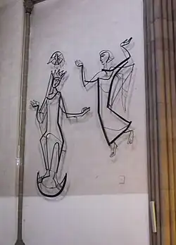 In den Jahren 1954 bis 1961 folgten weitere Baumaßnahmen. So wurden nach und nach die teilweise beschädigten oder unansehnlich gewordenen alten Kirchenbänke durch neue ersetzt. An die Stelle der Seitenaltäre traten zwei schwarze Metallreliefs. Im rechten Seitenschiff wurde 1955 eine kleine Empore für die neue Orgel gebaut. In die Wand des linken Seitenschiffes wurde 1961 ein Kreuzweg als Sgraffito eingearbeitet und die Notverglasung der Kirchenfenster durch eine Buntverglasung ersetzt.[28]