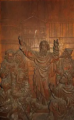 Die rechts dargestellte Relieftafel, die die Geschichte vom Mannaregen und der beiden Wasserwunder zu einer Szene zusammenzieht, entspricht demnach als Verheißung der Erfüllung in der Szene der Hochzeit von Kana. Das Himmelsbrot Manna wird in der Bibel (Ex 16 ) als die Speise bezeichnet, die den Israeliten auf ihrer 40-jährigen Wanderschaft durch die Wüste von Gott als Nahrung gegeben worden war. Diese Speise fiel nachts auf den Wüstenboden und konnte des Morgens aufgesammelt werden. Im Neuen Testament (Joh 6,28–35 ) bezeichnet sich Jesus Christus unter Hinweis auf dieses Manna als „Brot des Lebens“: