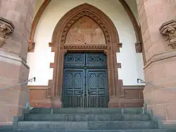 Die Kirche ist im neofrühgotischen Stil erbaut. Sie ist als dreischiffige Hallenkirche mit Querschiff angelegt. Die Haupttreppe mit zwei Podesten, die die Symbole der Evangelisten tragen sollten, führt von der Kaiserstraße in 33 Stufen (die traditionelle Zahl der Lebensjahre Jesu) hinauf zur Plattform, die den Turm umgibt. Von dieser Stelle führen weitere 11 Stufen ins Innere der Kirche. Über dem Eingangsportal befindet sich ein Relief mit der Szene, in der Jesus im Tempel von seinen Eltern wiedergefunden wird.[9] Unter diesem Relief ist ein Bibelzitat in den Stein gemeißelt (Lukas 2,49 ).