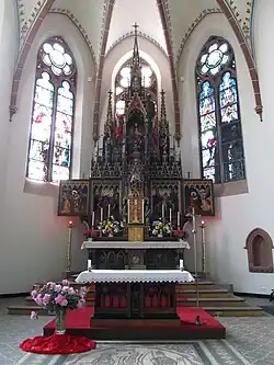 Der Hochaltar, ein Flügelaltar, ist ein Werk des Bildhauers Stuchtei aus Münster, der auch für den Orgelprospekt und die Kanzel verantwortlich zeichnet. Die Mensa des Hochaltars, bestehend aus weißem Baumberger Kalksandstein, ist aufgebaut auf einem Unterbau von fünf Stufen. In der Mitte der Mensa sieht man eine Darstellung des Lamm Gottes. Links und rechts davon befinden sich Glasmosaikbilder mit Tierdarstellungen. Der Aufbau des Hochaltars zeigt den Tabernakel, darüber ein verschließbares Expositorium, hinter dem sich der hohe mittlere Baldachin des Altars erhebt. In diesem Baldachin sieht man eine figürliche Darstellung Christi als Weltenrichter, darüber thront Gottvater und über diesem der Heilige Geist in der Darstellung der Taube. Der mittlere Baldachin wird flankiert von zwei weiteren Baldachinen. Im linken sehen wir die Mutter Gottes, in dem rechten Johannes den Täufer. Die Reliefs unterhalb der Seitenbaldachine zeigen die Geißelung und die Dornenkrönung Jesu. Sie beziehen sich, ebenso wie die Altarflügelbilder, auf das heilige Messopfer. An den Reliefs sind bemalte Flügel angebracht, die entweder auf- oder zugeschlagen werden können. Die aufgeschlagenen Flügel zeigen Christus am Ölberg und die Kreuztragung Christi, während auf den Rückseiten das Wunder der Brotvermehrung und der Mannaregen in der Wüste zu sehen sind.[8]