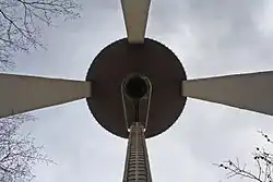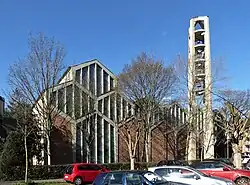 Der 25 Meter[5] hohe Glockenturm steht als separater Campanile an der nordöstlichen Gebäudeseite; er ist ein auf die Funktion beschränktes „Glockengestell“[1] aus vier Betonstelen, die zentriert von fünf Betonscheiben zusammengehalten werden. Diese dienen auch als Aufhängung bzw. Geschosse für die vier Glocken.