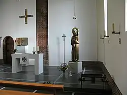Über einen Stufensockel betritt man einen schlichten Kirchenraum, dessen Hauptakzent von einer künstlerisch bedeutenden lebensgroßen Josephsfigur aus Lindenholz der Bildhauerin Harriet Ellen Siderovna von Rathlef-Keilmann (1887–1933) gesetzt wird. Ihr gegenüber befindet sich eine Marienfigur als Lindenholz-Replikat der „Schönen Gottesmutter“ von Breslau von 1390.