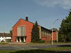 Die einschiffige Hallenkirche wurde nach Plänen des Architekten Josef Fehlig erbaut und verfügt über 360 Sitzplätze. Ein Stahlskelett bildet die tragende Konstruktion der Kirche. Aus Kostengründen hatte man auf den Bau eines Kirchturms verzichtet und stattdessen einen Dachreiter errichtet. Unter dem Chorraum befindet sich eine Krypta.