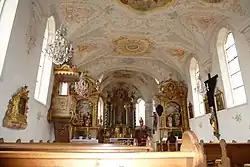 Unter dem Weihenstephaner Abt Ildefons Huber erfolgte 1735/36 die Barockisierung der Kirche. Dabei wurde die Rippen des gotischen Gewölbes abgeschlagen und die Deckenzone mit reichem Stuck und Deckengemälden im Stil des frühen Rokoko verziert. Der Chorbogen und die Fensteröffnungen, die vormals spitzbogig ausgeführt waren, wurden barock ausgerundet. Außerdem erhielt die Kirche damals ihre prunkvolle, im Wesentlichen bis heute erhaltene Ausstattung im Stil des Spätbarock bzw. Frührokoko. Die Kanzel dagegen ist erst 1778 entstanden und stellt somit ein Spätrokokowerk dar.[2]