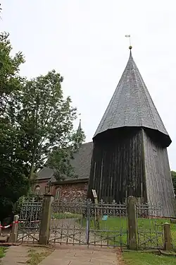 Der separate Glockenstapel neben der Kirche trägt eine Wetterfahne mit der Jahreszahl 1984, ist jedoch durch eine Inschrift auf 1685 datiert. In ihm hängen zwei Glocken von 1600 und 1681.[16]