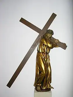 Im Turm der Kirche befindet sich eine Figur des Kreuztragenden Jesus.