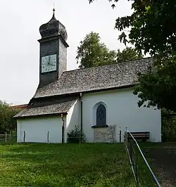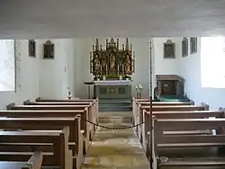 Der Chor besitzt unter seinem Korbbogen ein nach Osten ausgerichtetes Spitzbogenfenster und auf der Südseite ein breiteres Fenster. Das Kirchenschiff weist eine flach gewölbte Putzdecke über Kehle auf, die sich an der Achse eines Spitzbogenfensters orientiert. Die Sakristei besitzt ein Tonnengewölbe und zeigt nach Westen und Osten je ein gotisches Rechteckfenster. Im Deckbrett der Emporentäfelung sind die Jahreszahlen 1732, 1759 und 1826 eingeritzt. Unter der Empore auf der Westseite befindet sich der spitzbogige Eingang in einer Stichbogennische. Der Dachreiter über dem Chor trägt eine Zwiebelhaube.