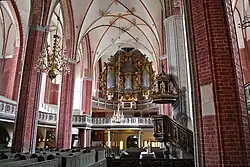 Beachtlich sind die Maße der Kirche mit einer Länge von 73 m und einer Breite von 29 m: das Dach erreicht eine Höhe von 38 m. Die Höhe des imposanten Dachstuhls, eines zu besichtigenden Meisterwerkes spätmittelalterlicher Zimmermannskunst, übertrifft die Höhe des Schiffes bis zur Traufe. Der Turm ist gut 72 m hoch. Das Schiff wurde, was in Höhe des Dachstuhls noch sehr gut zu erkennen ist, in der ersten Bauphase mit einem glatten Ostgiebel abgeschlossen. Erst später wurde ein polygonaler Hallenchor mit Umgang angefügt. Die Strebepfeiler sind nach innen gezogen und bilden tiefe Fensternischen, die jedoch untereinander durch schmale spitzbogige Durchbrüche in den Pfeilern verbunden sind. Das Mittelschiff wird durch ein Parallelrippengewölbe überspannt, das letztlich auf dasjenige des Veitsdoms zu Prag zurückgeht. Im Chorumgang entstehen durch die ungleichen Brechungen des Außenpolygons aus fünf Seiten eines Zehnecks und der Innenpfeiler Kreuzrippengewölbe abwechselnd mit Dreistrahlgewölben. Die Seitenkapellen zeigen verschiedene Sterngewölbeformen.