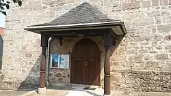 An der südlichen Kirchenaußenwand befinden sich Grabsteine verschiedener Pfarrer. Südlich der Kirche sind noch Reste der ehemaligen Umwehrung in Form einer Bruchsteinmauer vorhanden.