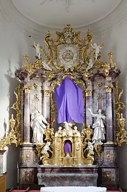 Die giebelständige Saalkirche wurde von 1766 bis 1767 nach einem Entwurf von Johann Michael Fischer gebaut.[1] Der oktogonale, dreigeschossige Fassadenturm im Norden des Langhauses hat einen Volutengiebel und ist mit einer schiefergedeckten Zwiebelhaube bedeckt. Sein oberstes Geschoss beherbergt die Turmuhr und den Glockenstuhl. Der eingezogene, außen dreiseitig, innen halbrund geschlossene Chor steht im Süden.