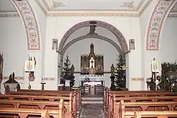 Die Farbfenster und die Ausstattung stammen überwiegend aus der Zeit um 1900. Bemerkenswert ist die Holzfigur einer Immaculata vom Ende des 17. Jahrhunderts.