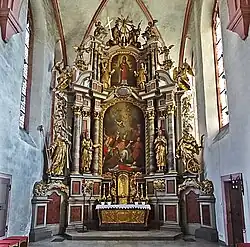Der Hochaltar wurde 1722 gebaut. Die barocke Kanzel, die 1715 gebaut wurde, ist mit einem aufwendig dekorierten Schalldeckel versehen, der mit einer Figur des auferstandenen Christus bekrönt ist. Die Orgel mit dem barocken Prospekt steht auf der oberen, der doppelstöckigen Empore. Sie hat 43 Register, 3 Manuale und ein Pedal und wurde 2004 von Hey Orgelbau gebaut.[1]