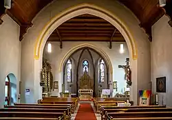 Die Gemeinde wurde 1319 gegründet. Die kreuzförmige Saalkirche wurde von 1899 bis 1901, unter Einbeziehung des im Kern mittelalterlichen Westturms und den Resten des alten Langhauses, aus verputztem Bruchstein errichtet. Am Turm mit gestufter Haube finden sich eine Inschriftentafel von 1567 und die Ankerzahl 1738. In das Innere des Querhauses wurde eine Flachdecke eingezogen, im Langhaus ruhen hölzerne Spitztonnengewölbe und im Chor Rippengewölbe auf Diensten. Die Farbfenster wurden 1901 von Henning & Andres angefertigt.