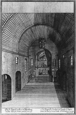 St. Klara war infolgedessen in den Besitz der Stadt Nürnberg übergegangen und wurde bereits ab 1574 als evangelische Predigtkirche benutzt. Dafür wurden Veränderungen am Gebäude vorgenommen, die jedoch aus der heutigen Gestalt der Kirche nicht mehr ersichtlich sind. Unter anderem wurde eine Kanzel eingebaut.[7] Der Universalgelehrte Christoph Gottlieb von Murr schreibt zu den Baumaßnahmen in seiner Beschreibung der vornehmsten Merkwürdigkeiten in des H.R. freyen Stadt Nürnberg von 1778 ohne weitere Erläuterung, die Kirche sei „inwendig 1574 verändert“ worden.