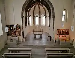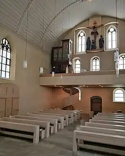 Das Gebäude ist seit dem letzten Umbau im Inneren hell gehalten; die dunklen Kirchenbänke wurden gegen solche aus hellem Eichenholz ersetzt, aus demselben Material besteht auch die Wendeltreppe, die auf die Empore führt. Auch die Holztonne hat seither einen hellen Anstrich.
