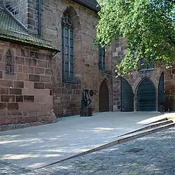 Der Eingangsbereich der Kirche wurde im Rahmen der Generalsanierung 2006/2007 umgestaltet. Bis zum Umbau betrat man die Kirche durch einen Eingang an der Nordseite des Langhauses; die Kapelle hatte separate Zugänge. Mit dem Umbau wurde der Eingangsbereich so gestaltet, wie er bereits in der Zeit bis 1945 angelegt war: Der Zugang an der Nordseite des Langhauses wurde geschlossen, neuer Haupteingang ist die Ostpforte der Pirckheimerkapelle. Der Vorplatz wurde mit einer Rampe versehen, um einen barrierefreien Zugang zu dem Gebäude zu ermöglichen.[14] Auf dem Vorplatz steht die 1957 geschaffene Bronzeplastik Hiob von Gerhard Marcks.