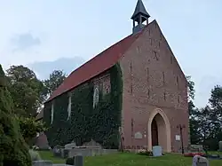 Die Saalkirche aus Backsteinen, ursprünglich eine Wehrkirche, stammt zum großen Teil aus dem 13. Jahrhundert. Sie wurde im Laufe der Jahrhunderte mehrfach verändert und vergrößert. Sie hat einen eingezogenen rechteckigen Chor. Der um 1300 errichtete Glockenturm aus zwei parallelen Mauern, der noch älter als das Kirchenschiff ist, steht separat an der Eckwarder Straße. Die halbrunde Apsis wurde 1876 abgebrochen. Das Kirchenschiff ist mit einem Satteldach bedeckt, aus dem sich im Westen ein offener quadratischer Dachreiter erhebt. Der Innenraum war ursprünglich mit drei Jochen gewölbt. Das Gewölbe wurde zunächst durch eine Voutendecke ersetzt. Diese wurde bei der letzten Renovierung von einer Holzbalkendecke abgelöst.