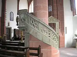 Die steinerne Kanzel ist eine bemerkenswerte Renaissancearbeit von Hans Schlachter aus dem Jahr 1583. In den Brüstungsfeldern wurden die vier Evangelisten und Christus als Salvator mundi nahezu vollplastisch herausgearbeitet. Das Geländer des Aufganges ist mit nachgotischem Maßwerk verziert. Dort befindet sich auch der halbe Eber des Stadtwappens. Ungewöhnlich ist das Portal mit seinem Dreiecksgiebel und einem bürgerlichen Wappenzeichen.