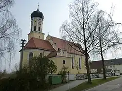 Die barocke Saalkirche wurde ab 1717 anstelle eines Vorgängerbaus nach einem Entwurf von Hans Georg Radmiller errichtet. Sie besteht aus einem Langhaus, das 1928 nach Westen verlängert wurde, einem eingezogenen, dreiseitig geschlossenen Chor im Osten, einem Chorflankenturm auf quadratischem Grundriss an der Südwand und der Sakristei an der Nordwand des Chors. Der Chorflankenturm wurde mit einem achteckigen Geschoss aufgestockt, das die Turmuhr und den Glockenstuhl beherbergt, und mit einer Zwiebelhaube bedeckt. Die Fassade im Westen des Langhauses, vor dem sich ein Anbau für das Foyer befindet, ist mit einem Schweifgiebel bedeckt.