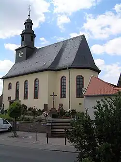 Die St. Laurentiuskirche befindet sich im Ortskern an der Kalbacher Hauptstraße auf einem Geländeplateau. Die barocke Saalkirche ist nach Nordosten ausgerichtet. Der vom Hauptbau zurückgestaffelte Chor endet mit einem Fünfachtelschluss. Die Seitenlängen des Baus betragen etwa zweiundzwanzig und elf Meter. Die verputzten Fassaden sind durch hohe Rundbogenfenster gegliedert. Das steil geneigte Schieferdach schließt im Westen mit einem hohen Dachreiter ab.