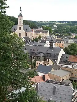 Die strenge, mehr klassizistische als barocke Emporenhalle wurde in den Jahren 1781–86 durch den Lichtensteiner Baumeister Muhrhardt an Stelle eines beim Stadtbrand zerstörten Vorgängerbauwerks des 13. Jahrhunderts erbaut, der Turm wurde im Jahr 1865 angefügt, ein Umbau erfolgte durch Christoph Gottfried Schramm aus Dresden in den Jahren 1886/89. Restaurierungen wurden in den Jahren 1919, 1929 und 1986 vorgenommen. Das Bauwerk ist ein Putzbau mit Apsis und niedrigem Treppentürmchen von 1889, die Westseite ist ebenfalls abgerundet. Der hohe schlanke Nordturm ist mit Glockendach und Laterne abgeschlossen.