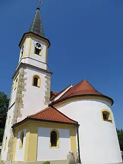 Die Saalkirche mit einem Langhaus aus drei Fensterachsen und einem eingezogenen, halbrund geschlossenen Chor wurde in der zweiten Hälfte des 18. Jahrhunderts erbaut. Der Chorflankenturm, der mit einem spitzen Helm bedeckt ist, wurde an der Südwand des Chors 1859/60 angebaut. Sein oberstes Geschoss beherbergt die Turmuhr und den Glockenstuhl.