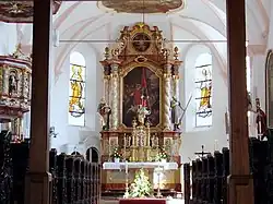 Der Hochaltar wurde im Jahr 1906 im Stile des Neobarock geschaffen. Der Aufbau wird von vier Säulen getragen, deren inneres Paar gewunden ist. Das Hauptbild zeigt den Kirchenpatron Laurentius auf dem Weg zu seinem Martyrium. Das Auszugsbild stellt die Heilige Familie dar. Beide Bilder wurden Georg Halter aus Regensburg gemalt. Die Seitenfiguren St. Anna (links) und St. Joachim (rechts) stammen noch vom Vorgängeraltar und wurden 1767 von dem Rottenburger Bildhauer Felix Pämmer geschaffen. Auf dem vergoldeten Tabernakel steht eine spätgotische Marienfigur aus der Zeit um 1470/80.[2]
