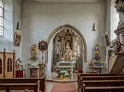 Die Saalkirche aus Quadermauerwerk wurde 1517 gebaut und 1681 erweitert. Der spätgotische Chorturm wurde um 1683 um ein Geschoss aufgestockt, das die Turmuhr und den Glockenstuhl beherbergt, und mit einer Welschen Haube bedeckt. Die Sakristei wurde erst 1871 angefügt. Der Innenraum des mit einem Satteldach bedeckten Langhauses ist mit einer Flachdecke überspannt, der des Chors, das heißt das Erdgeschoss des Chorturms, mit einem Netzgewölbe. Der reich dekorierte Hochaltar wurde 1686 aufgestellt. Es ist ein Werk des Bamberger Hofbildhauers Johann Samuel Koch.[1] Auf dem Altarretabel ist der heilige Laurentius dargestellt, flankiert von Petrus und Paulus. Aus dem mittelalterlichen Vorgängerbau hat sich ein Sakramentshaus erhalten.