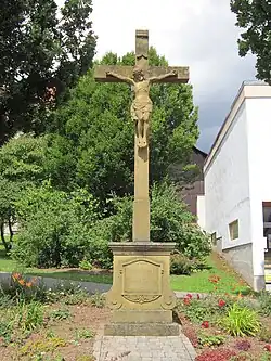 Im Jahr 1911 entstand das vor der Kirche befindliche Hochkreuz.[18] Das Kreuz besteht aus Sandstein und befindet sich auf einem Sockel mit seitlichen Voluten, an dessen Seite die Stiftungsinschrift mit der Datierung 1911 angebracht ist.[18]