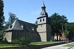 Diese Kirche ist einst dem heiligen Laurentius geweiht gewesen. Darauf deutet noch der Rost im Ortswappen hin. Am Gasthaus „Goldener Löwe“ befindet sich dieser Stein mit dem Rost (unten) und dem hl. Laurentius (oben) in bedeutender Haltung. Die Kirche wurde 1594 an der Stelle der alten, baufällig gewordenen erbaut. Eine von Grund auf neue Kirche aus Stein wurde gebaut und schon nach einem Monat war sie wieder gerichtet. Die Gemeinde übernahm die Fronarbeiten und sammelte selbst Geld für den Neubau der Kirche. Die Weihe der Kirche nahm Pfarrer Nicolaus Stier am 1. Juni 1594 vor. In einen extra ausgehöhlten Stein unter dem Altar kamen ein Verzeichnis der Spender und Bauherren sowie die Rede, die der Pfarrer zur Weihe der Kirche gehalten hat. Über dem Turmeingang im Osten zeigen zwei Inschriften diese Zahl, dazu die Namen der Baumeister, des Pfarrers und der Kirchenältesten. 1731 wurde die Kanzel über den Altar verlegt und 1739 die neue Orgel darüber eingebaut, so dass das Kircheninnere das heutige Aussehen erhielt. Die Glocken hingen damals in einem Holzgerüst neben der Kirche, das 1669 durch den jetzigen Turm ersetzt wurde. Die Kirche ist ein Beispiel des Schwarzburger Bauernbarock.