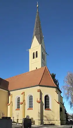Die gotische Saalkirche wurde 1464 erbaut. Sie besteht aus dem 1680 erneuerten und 1930 nach Westen auf sechs Joche verlängerten Langhaus mit 1740 angebauten querschiffsartigen Kapellen, dem eingezogenen, dreiseitig geschlossenen Chor im Osten, der von Strebepfeilern gestützt wird, der Sakristei an der Südwand und dem Chorflankenturm an der Nordwand des Chors. In der Glockenstube obersten Geschoss des Turms hängen hinter auf jeder Seite jeweils zwei spitzbogigen Schallöffnungen vier Glocken, die 1949 von Karl Hamm aus Regensburg gegossen wurden. Um die Wende zum 19. Jahrhundert hatte die Kirche noch drei Glocken aus den Jahren 1865, 1749 und 1667, die jedoch in den beiden Weltkriegen zum Einschmelzen abgeliefert werden mussten, um Kriegsmaterial herzustellen. Über den Giebeln erhebt sich ein spitzer Helm; am Nordgiebel ist das Zifferblatt der Turmuhr angebracht. Im Innenraum des Langhauses sind die drei mittleren Joche mit einer ovalen Flachkuppel überspannt.
