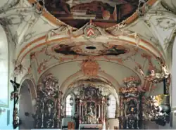 Die Deckenmalereien gestaltete 1760/61 Johann Georg Dieffenbrunner. Im Gemälde über dem Altarraum ist die Verherrlichung des heiligen Laurentius und seine Aufnahme in den Himmel dargestellt. Die ihn begleitenden Engel halten die Martyrerpalme und den Lorbeerkranz, Über ihm schweben Gottvater, Jesus und in Gestalt der Taube der Heilige Geist. Das Bild ist etwa 5,60 × 4,00 Meter groß. Die Deckenfresken im Kirchenschiff zeigen in der ersten Achse ein Engelskonzert und in der mittleren der drei Langhausachsen in 8,60 Meter Höhe Szenen aus dem Leben des heiligen Laurentius. Im westlichen Teil dieses 10,60 × 5,85 Meter großen Bildes ist die Gefangennahme des heiligen Papstes Sixtus II. im Jahr 258 dargestellt, zu dem Laurentius als Diakon gehörte. Im letzten Bild wird das Martyrium des hl. Laurentius gezeigt. Soldaten kommen zu der Stelle, wo das Feuer unter dem Rost geschürt wird, auf dem Laurentius stirbt.[1]
