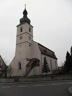 Das mit einem Mansarddach bedeckte Langhaus der Saalkirche wurde 1754/55 nach Plänen von Johann David Steingruber erbaut. Der Chorturm aus der 1. Hälfte des 15. Jahrhunderts wurde 1705–09 aufgestockt, um die Turmuhr und den Glockenstuhl unterzubringen, und mit einer schiefergedeckten Welschen Haube bedeckt. Der Innenraum des quadratischen Chors, d. h. das Erdgeschoss des Chorturms, ist mit einem Kreuzrippengewölbe überspannt, der des Langhauses, der mit doppelstöckigen Emporen an drei Seiten ausgestattet ist, mit einem Spiegelgewölbe, das mit Stuck gerahmt ist. Zur Kirchenausstattung gehören der 1720 gebaute Altar, die 1688 gebaute Kanzel und das 1685 gebaute Taufbecken unter einem Baldachin auf vier Säulen.