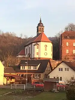 Die Kirche befindet sich am Leidenweg 1 und steht unter Denkmalschutz. Es handelt sich um einen barocken Saalbau mit eingezogenem polygonalen Chor und Dachreiter. Um die Kirche besteht eine hohe Futtermauer. Die Bauten sind mit den Jahren 1716 und 1731 bezeichnet.[1]