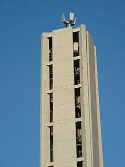 Der 35 Meter hohe Kirchturm birgt seit dem 19. November 1958 vier Glocken, welche in der Glockengiesserei Rüetschi in Aarau gegossen wurden. Es handelt sich um die Christus-, die Marien-, die Apostel- und die Schutzengelglocke. Der Turm wird von einer von Künstler Albert Schilling gestalteten Turmkrone abgeschlossen, die in zweidimensionaler Ausführung auch die Frontseite der Kirche schmückt.[6]