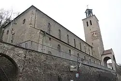 Die traufständige, dreischiffige Basilika besteht aus einem Langhaus, einem eingezogenen, dreiseitig geschlossenen Chor im Norden und einem Chorflankenturm an dessen Ostwand, auf dessen flachen Pyramidendach ein offener Dachreiter sitzt. Außen an der Südwand steht eine Statue des heiligen Laurentius auf einer Konsole.