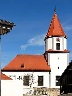 Das Langhaus der Saalkirche, das achteckige oberste Geschoss des mittelalterlichen Chorturms, das die Turmuhr und den Glockenstuhl beherbergt, und mit einem spitzen Zeltdach bedeckt ist, wurde 1737 nach einem Entwurf von Giovanni Domenico Barbieri errichtet.