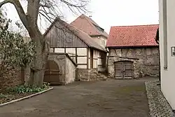 Die Kirche ist von einer spätmittelalterlichen Kirchenburganlage umgeben. An die Mauern wurden im späten Mittelalter steinerne Keller zur Aufbewahrung von Vorräten angebaut, die dann ungefähr im 17. und 18. Jahrhundert mit Fachwerkgaden überbaut wurden. Diese Gaden wurden als Lager und Ställe genutzt; nur das Gebäude an der Süd-Westecke der Anlage, das sog. Armenhaus, diente Wohnzwecken. An der Südseite der Anlage wurden 3 Kirchengaden unter Rücksichtnahme auf die historische Bausubstanz restauriert.[2]