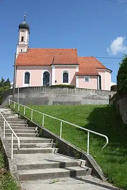 Die Saalkirche wurde 1779/80 nach einem Plan von Johann Georg Hitzelberger erbaut. Sie besteht aus einem Langhaus, einem eingezogenen, halbrund geschlossenen Chor im Osten, der Sakristei an der Südwand des Chors und einem wie ein Risalit wirkenden Fassadenturm auf quadratischem Grundriss im Westen, dessen achteckiges Obergeschoss den Glockenstuhl und die Turmuhr beherbergt und der mit einer Zwiebelhaube bedeckt ist. Der Innenraum des Langhauses ist mit einer Flachdecke überspannt. Im Westen befindet sich eine Empore, auf der die Orgel steht. Die Fresken wurden 1780 vom Vater des Josef Wintergerst eingebracht. Auf dem Altarretabel des Hochaltars ist Leonhard von Limoges dargestellt. Eine Himmelfahrtsmadonna, wohl von Hans Thoman aus Memmingen stammend, ist um 1520 entstanden. Das Kruzifix am Chorbogen wurde um 1720 geschaffen.