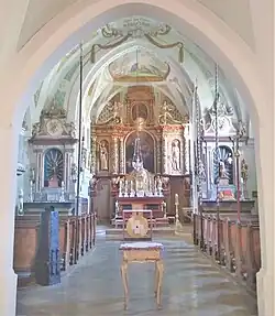 - Im Kern spätgotischer Saalbau mit eingezogenem Polygonalchor und zweigeschossiger Erweiterung auf der Nordseite, Westturm mit Welscher Haube, erbaut 1460, Anbau 1592, Barockisierung und Vereinheitlichung 1609, Turm 1769; mit Ausstattung.