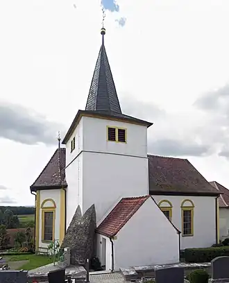 Der Vorgängerbau, eine Kapelle, geht auf das Kloster Langheim zurück, das hier Besitzrechte hatte. Die Saalkirche wurde 1695/96 unter Johann Philipp von Greiffenclau zu Vollraths erbaut, dessen Wappen über dem Portal im Norden zu sehen ist. Sie besteht aus einem barocken Langhaus, das mit einem Satteldach bedeckt ist, einem eingezogenen, dreiseitig geschlossenen Chor im Osten und einem spätgotischen Chorflankenturm mit angebauter Sakristei an seiner Nordseite, der mit einem achtseitigen, schiefergedeckten Knickhelm bedeckt ist, und dessen oberstes Geschoss den Glockenstuhl beherbergt, in dem seit 1949 wieder drei neue Kirchenglocken hängen, die von der Glockengießerei Heinrich Humpert hergestellt wurden. Die Kirchenausstattung, dazu zählen der Hochaltar, die beiden Seitenaltäre und die Kanzel, ist aus der Zeit um 1700. Der Volksaltar und der Ambo wurden 2006 beschafft.